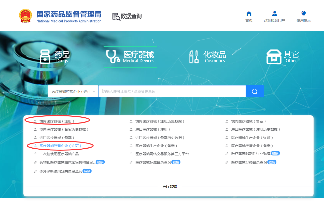 医疗器械生产许可证查询、医疗器械经营许可证和产品注册证号查询网址: