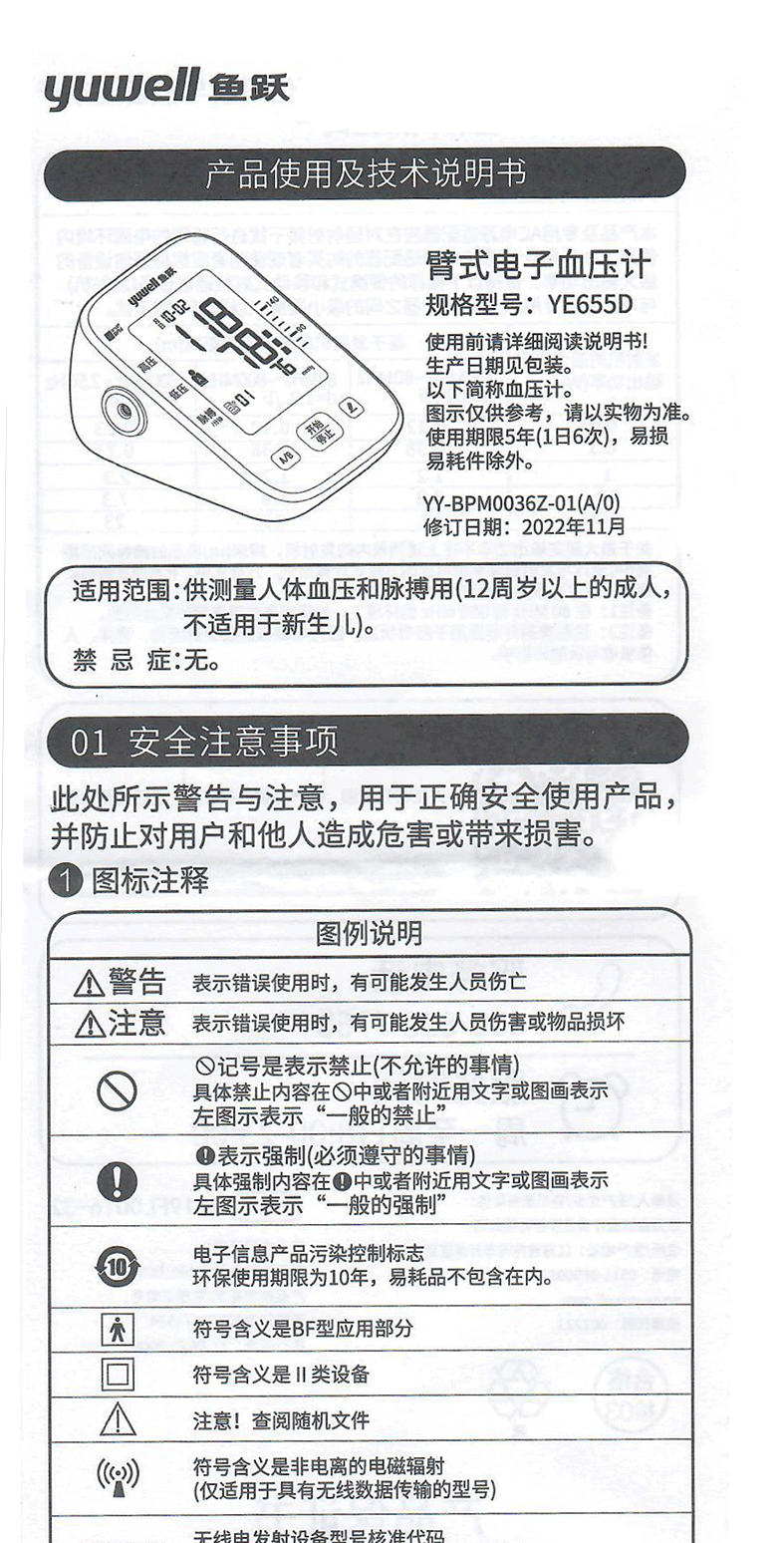 使用前请详细阅读说明书!生产日期见包装。以下简称血压计。图示仅供参考,请以实物为准。使用期限5年(1日6次),易损易耗件除外。