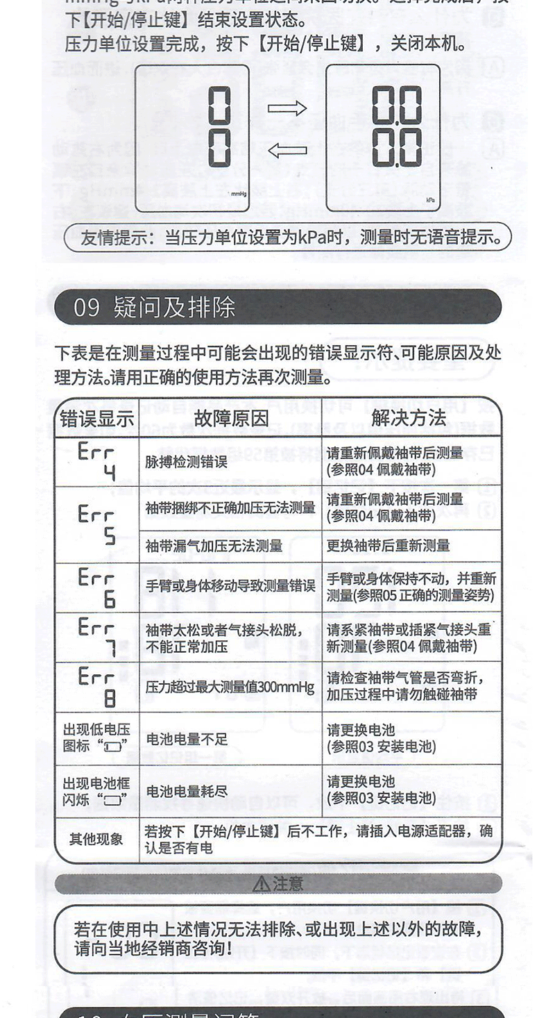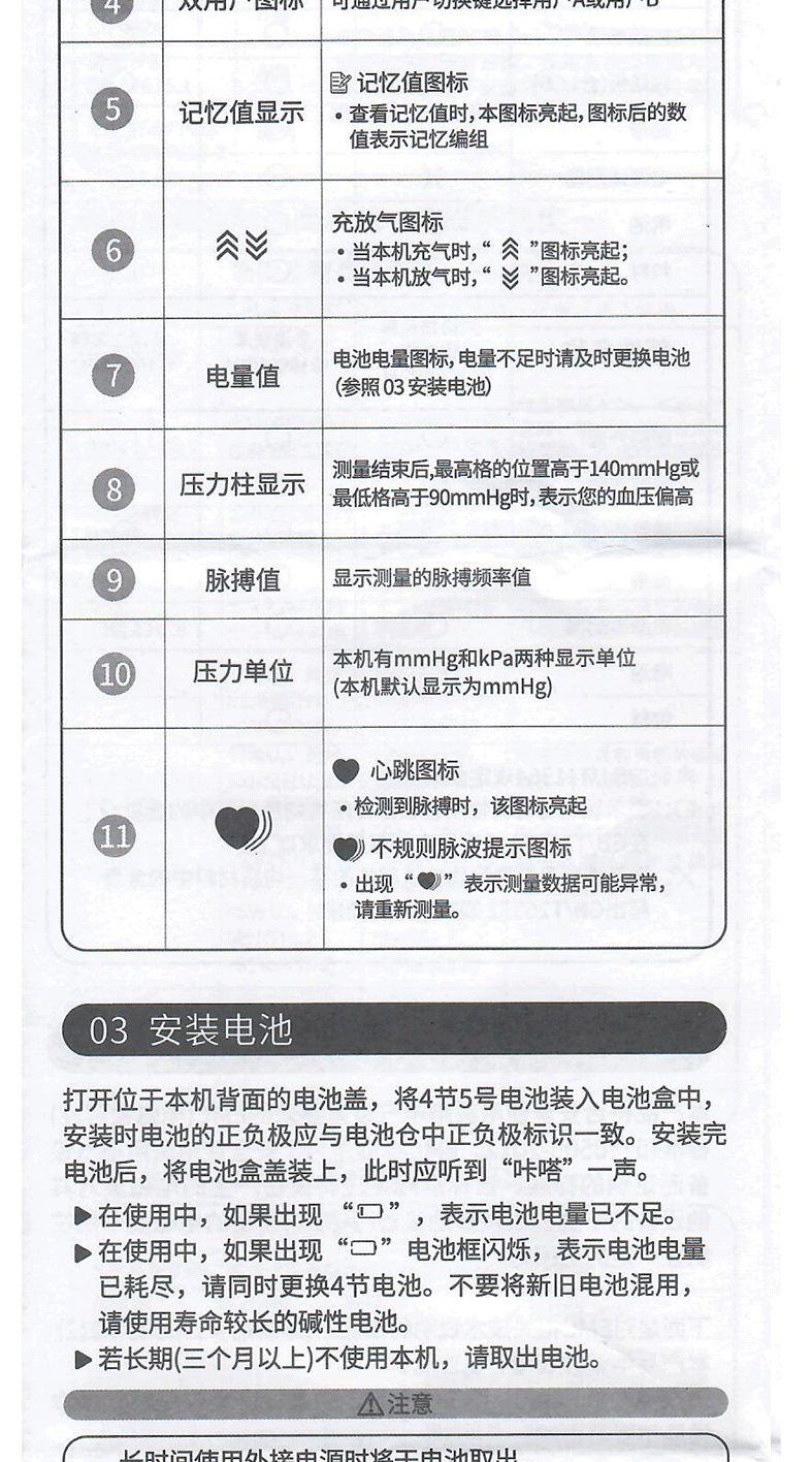 ⑦电量值电池电量图标,电量不足时请及时更换电池(参照03安装电池)8压力柱显示测量结束后,最高格的位置高于140mmHg或最低格高于90mmHg时,表示您的血压偏高⑨脉搏值显示测量的脉搏频率值10压力单位本机有mmHg和kPa两种显示单位(本机默认显示为mmHg)