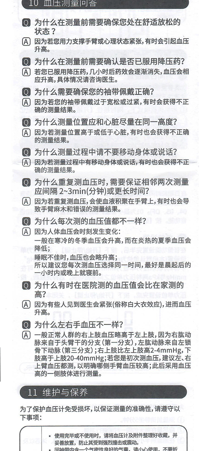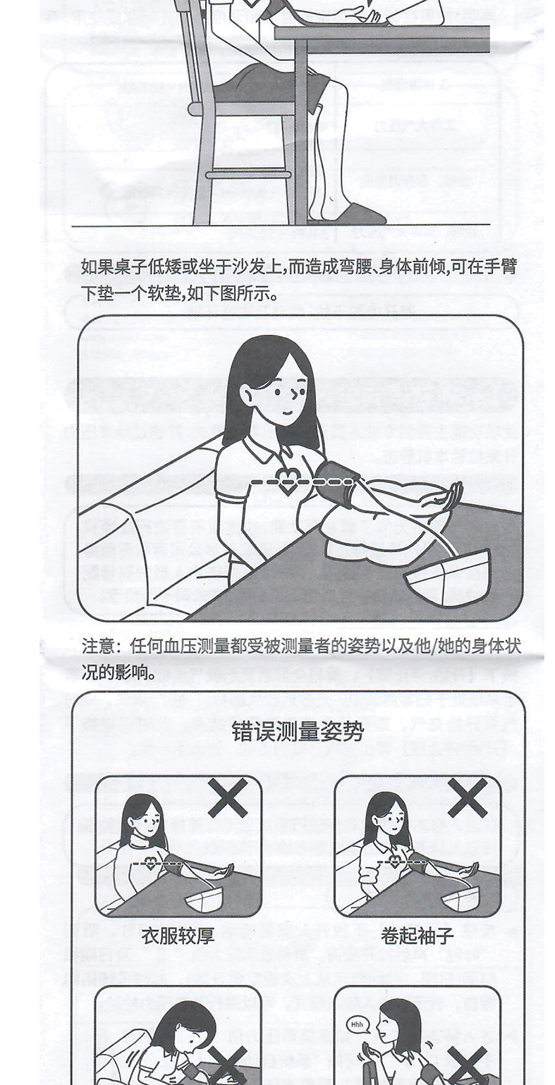 ·测量前请静坐5分钟,再采用正确姿势进行测量。