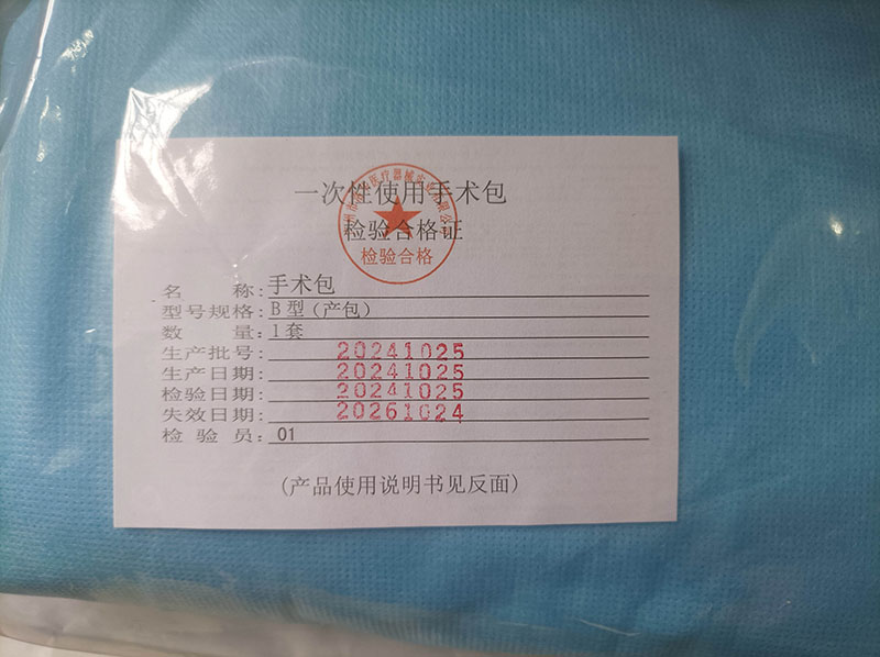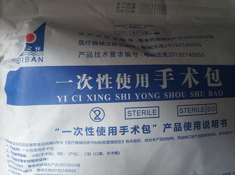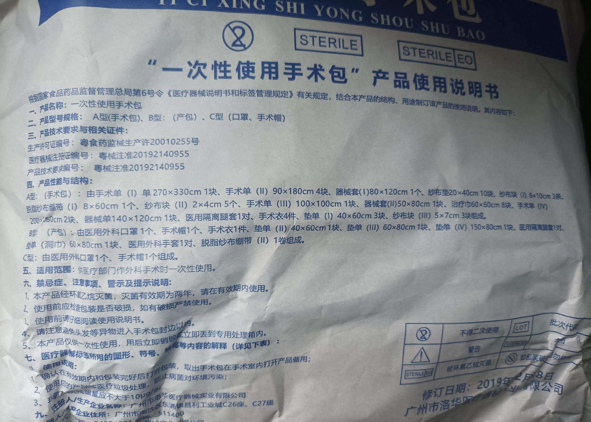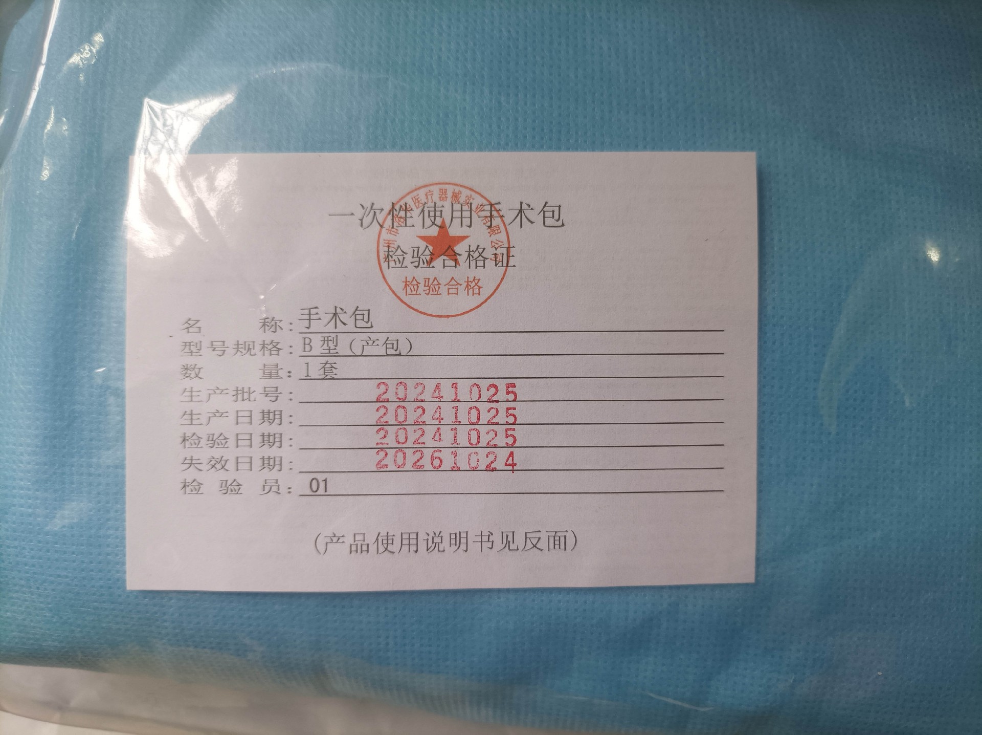 B型产包配件表由医用外科口罩1个、手术帽1个、手术衣1件、40×60cm垫单1块、60×80cm垫单1块、150×80cm垫单1块、医用隔离腿套1对。、60*80洞巾垫单1块、外科手套1对、II脱脂纱布绷带1卷组成。